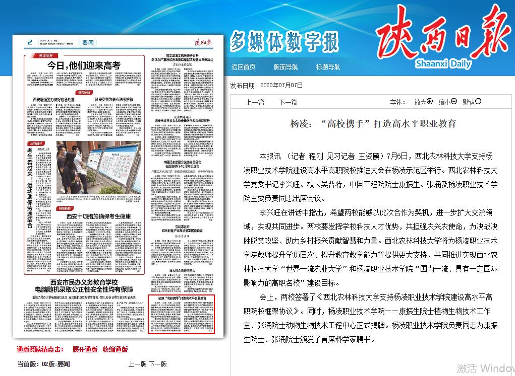 本报讯 (记者 程刚 见习记者 王姿颐)7月6日,西北农林科技大学支持杨凌职业技术学院建设高水平高职院校推进大会在杨凌示范区举行。西北农林科技大学党委书记李兴旺、校长吴普特,中国工程院院士康振生、张涌及杨凌职业技术学院主要负责同志出席会议。