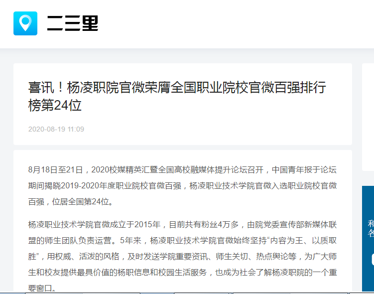 8月18日至21日,2020校媒精英汇暨全国高校融媒体提升论坛召开,中国青年报于论坛期间揭晓2019-2020年度职业院校官微百强,杨凌职业技术学院官微入选百强院校,位居全国第24位。