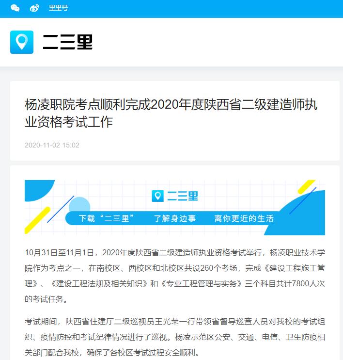 10月31日至11月1日,2020年度陕西省二级建造师执业资格考试举行,杨凌职业技术学院作为考点之一,在南校区、西校区和北校区共设260个考场,完成《建设工程施工管理》、《建设工程法规及相关知识》和《专业工程管理与实务》三个科目共计7800人次的考试任务。