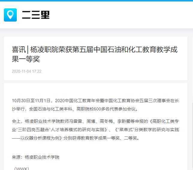 会上,杨凌职业技术学院教师冯雷雷、周博、高冬梅、李黔蜀等申报的《高职化工类专业“三阶四岗五融合”人才培养模式的研究与实践》、《“菜单式”分类教学的研究与实践——以仪器分析课程为例》分别获得教育教学成果一等奖、二等奖。