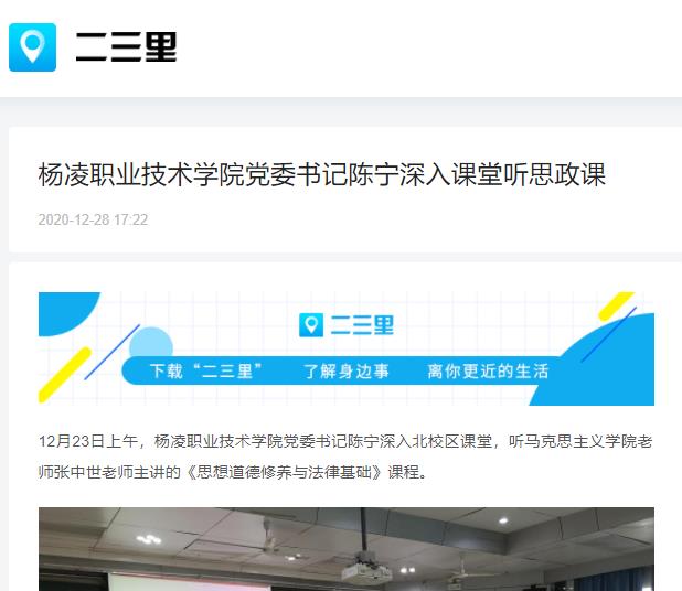 12月23日上午,杨凌职业技术学院党委书记陈宁深入北校区课堂,听马克思主义学院老师张中世老师主讲的《思想道德修养与法律基础》课程。