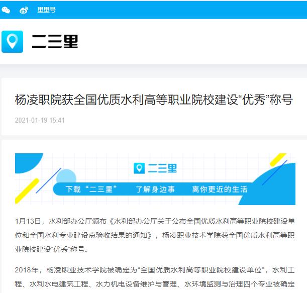 1月13日,水利部办公厅颁布《水利部办公厅关于公布全国优质水利高等职业院校建设单位和全国水利专业建设点验收结果的通知》,杨凌职业技术学院获全国优质水利高等职业院校建设“优秀”称号。