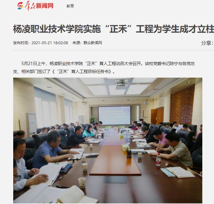 5月21日上午,杨凌职业技术学院“正禾”育人工程动员大会召开。该校党委书记陈宁与各党总支、相关部门签订了《“正禾”育人工程目标任务书》。