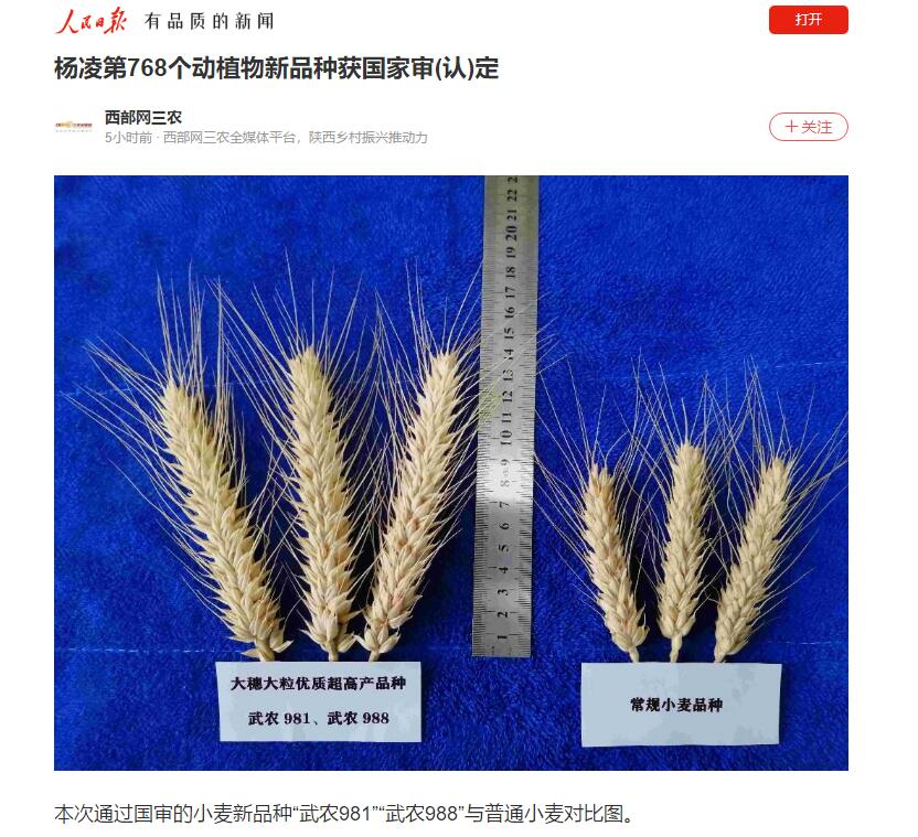 本次通过农业农村部2021年审定的小麦新品种我省共有7个。其中,杨凌占据6席,分别是“西农733”“西农235”“西农629”“荣华116”“武农988”“武农981”。