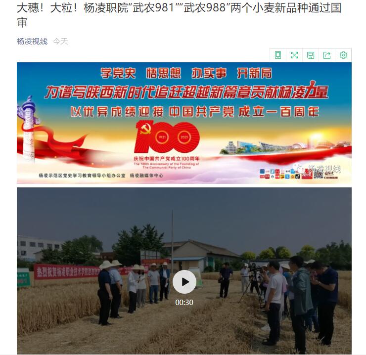 6月11日上午,记者从豆村农场举行的赵瑜研究员小麦新品种新闻发布会上了解到:6月9日,农业农村部公告第432号—2021年小麦品种审定公告发布,由杨凌职业技术学院研究员赵瑜团队培育出的“武农981”“武农988”两个小麦新品种通过国家农作物品种审定委员会审定。