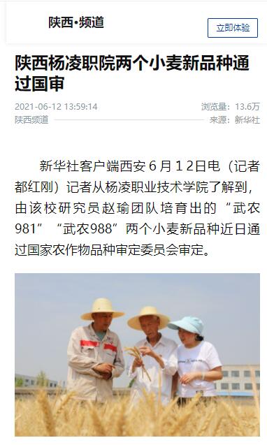 新华社客户端西安6月12日电(记者都红刚)记者从杨凌职业技术学院了解到,由该校研究员赵瑜团队培育出的“武农981”“武农988”两个小麦新品种近日通过国家农作物品种审定委员会审定。