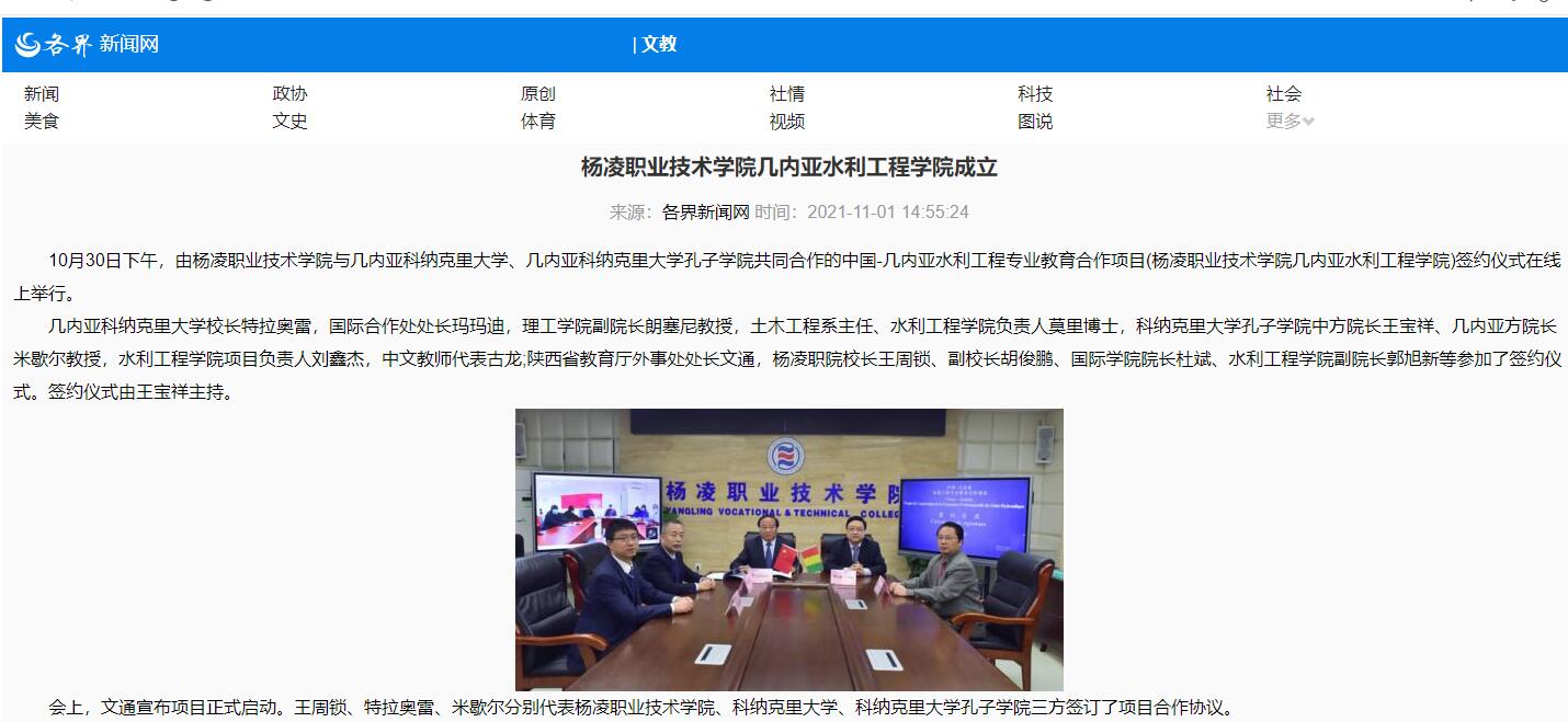 10月30日下午,由杨凌职业技术学院与几内亚科纳克里大学、几内亚科纳克里大学孔子学院共同合作的中国-几内亚水利工程专业教育合作项目(杨凌职业技术学院几内亚水利工程学院)签约仪式在线上举行。