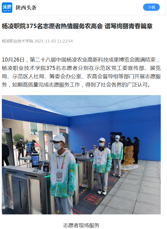 10月26日,第二十八届中国杨凌农业高新科技成果博览会圆满结束,杨凌职业技术学院375名志愿者分别在示范区党工委宣传部、展览局、示范区人社局、筹委会办公室、农高会督导组等部门开展志愿服务,如期高质量完成志愿服务工作,得到了社会各界的广泛认可。