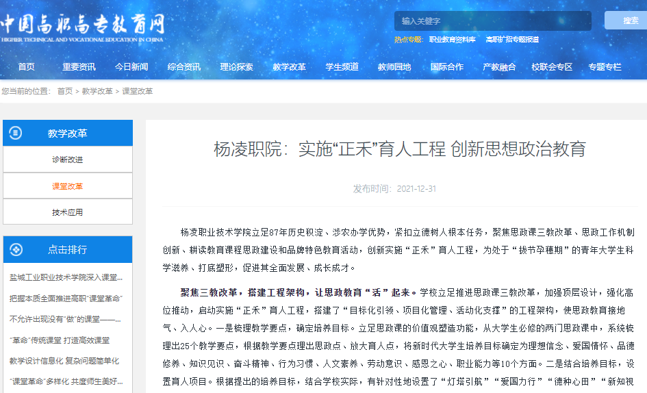 杨凌职业技术学院立足87年历史积淀、涉农办学优势,紧扣立德树人根本任务,聚焦思政课三教改革、思政工作机制创新、耕读教育课程思政建设和品牌特色教育活动,创新实施“正禾”育人工程,为处于“拔节孕穗期”的青年大学生科学滋养、打底塑形,促进其全面发展、成长成才。