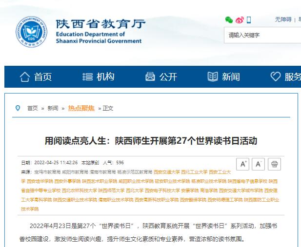 【杨凌职业技术学院】2022年4月18日,该院举行了“4.23世界读书日”系列活动启动仪式,对世界读书日十项活动进行了安排,对2021年度“优秀读者”进行了表彰。此次系列活动分线上和线下两种方式,4月18日至30日举行,包括阅读文化创意设计大赛、数字资源检索达人挑战赛、数字资源系列讲座、“你读书 我买单”图书展销、开通线上图书推荐平台、知名作家读书创作交流会、宣传图书馆各类数字资源、线上数字资源竞赛等十余项内容。近年来,学院高度重视校园文化氛围营造,积极构建全方位耕读教育体系,深化立德树人根本使命。此次“世界读书日”系列活动也是“推进全民阅读,建设书香校园”的重要举措,对于提高广大师生的人文素养和综合能力具有深远意义。