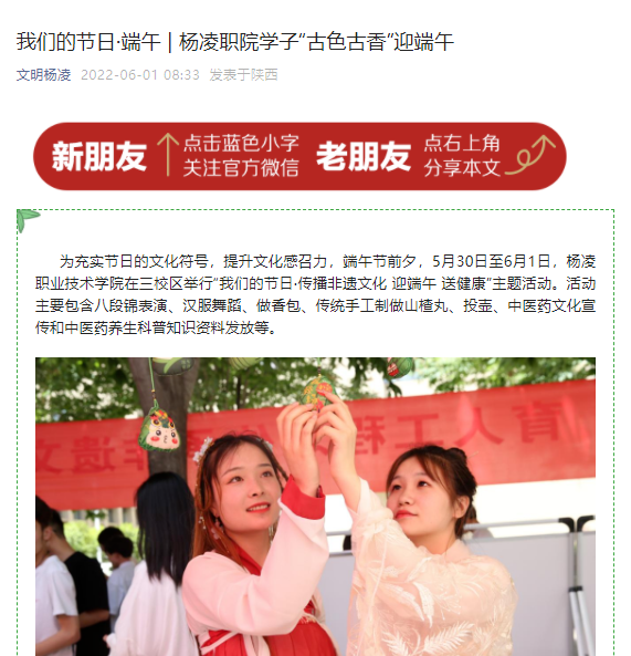 为充实节日的文化符号,提升文化感召力,端午节前夕,5月30日至6月1日,杨凌职业技术学院在三校区举行“我们的节日·传播非遗文化 迎端午 送健康”主题活动。活动主要包含八段锦表演、汉服舞蹈、做香包、传统手工制做山楂丸、投壶、中医药文化宣传和中医药养生科普知识资料发放等。