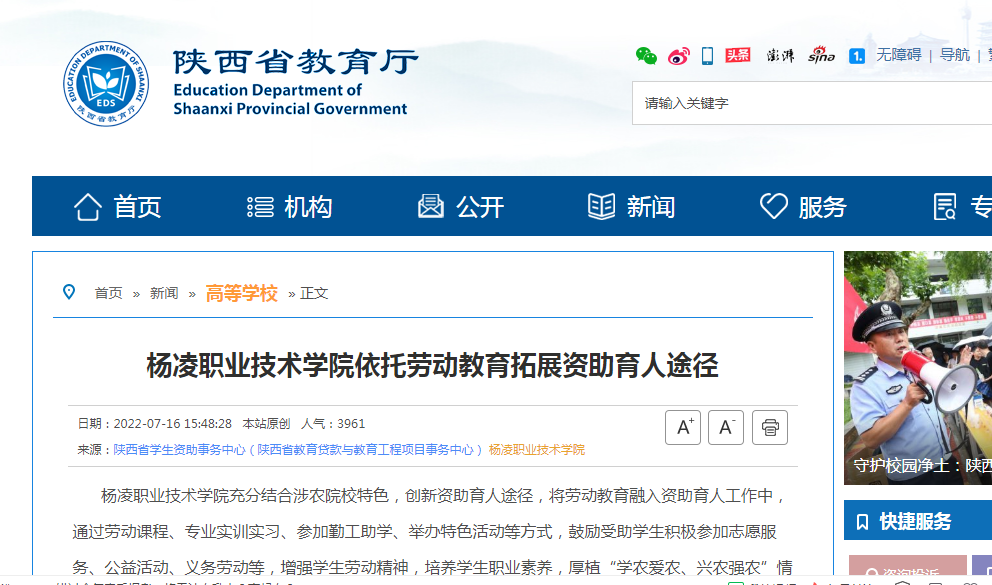 杨凌职业技术学院充分结合涉农院校特色,创新资助育人途径,将劳动教育融入资助育人工作中,通过劳动课程、专业实训实习、参加勤工助学、举办特色活动等方式,鼓励受助学生积极参加志愿服务、公益活动、义务劳动等,增强学生劳动精神,培养学生职业素养,厚植“学农爱农、兴农强农”情怀,推动学生全面发展,深化资助育人成效。