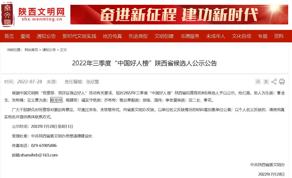 根据中国文明网“我推荐、我评议身边好人”活动有关要求,现对2022年三季度“中国好人榜”陕西省拟推荐的8名候选人予以公示。他们是,助人为乐类:曹金生、池彬锋;见义勇为类:程宝存、程建军;诚实守信类:乔彬彬;敬业奉献类:赵瑜、温伟;孝老爱亲类:田二女、秦花。