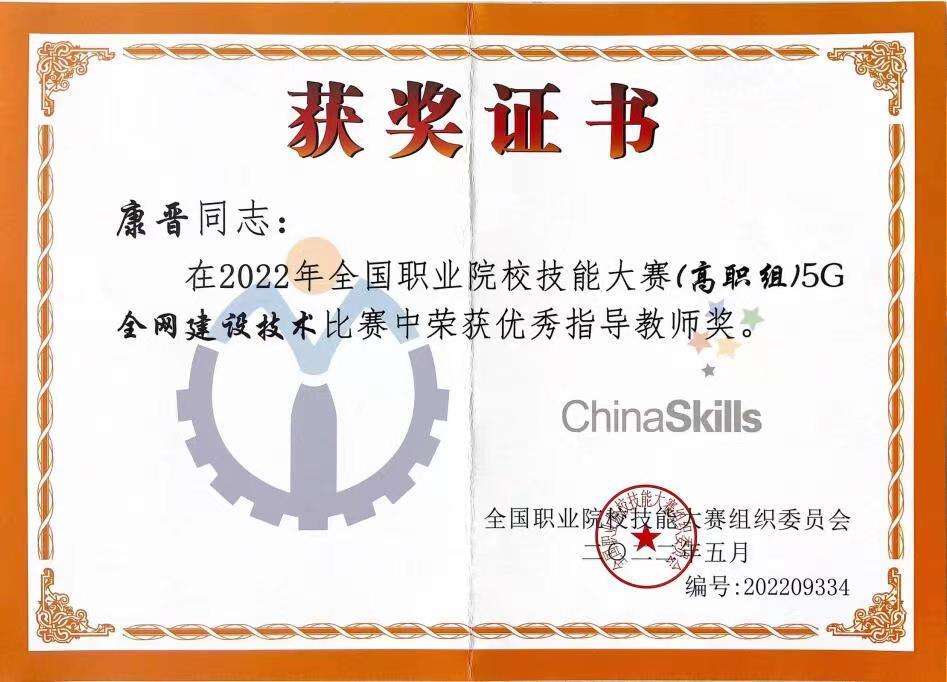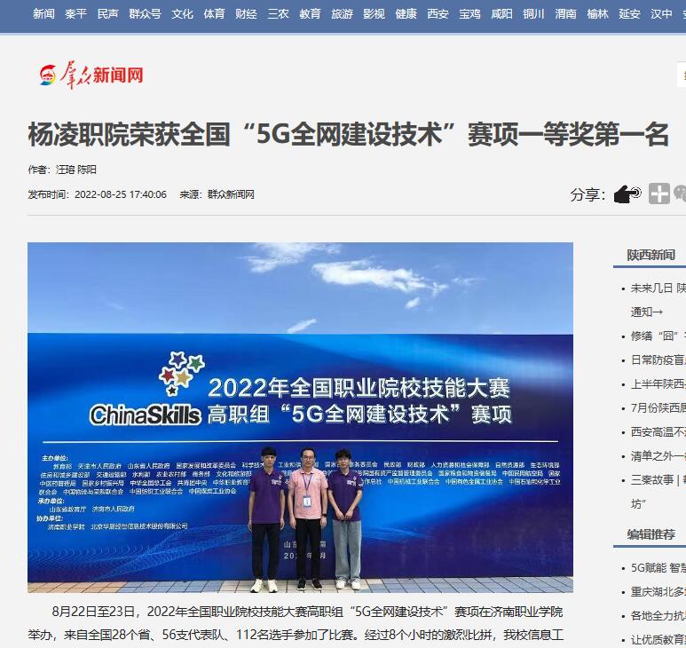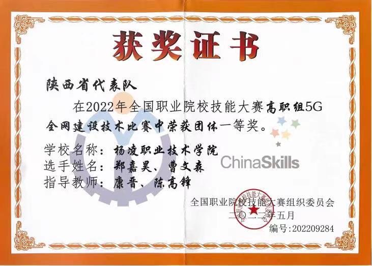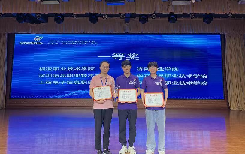 8月22日至23日,2022年全国职业院校技能大赛高职组“5G全网建设技术”赛项在济南职业学院举办,来自全国28个省、56支代表队、112名选手参加了比赛。经过8个小时的激烈比拼,伟德官网信息工程学院学生郑嘉昊、曹文森以总分排名全国第一的成绩,荣获一等奖第一名,取得伟德官网自参赛以来历史最好成绩,指导教师康晋、陈高锋荣获大赛优秀指导教师奖。