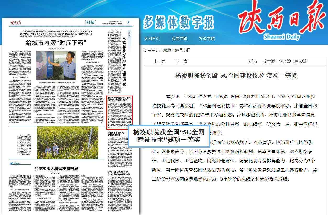 本报讯 (记者 仵永杰 通讯员 陈阳)8月22日至23日,2022年全国职业院校技能大赛(高职组)“5G全网建设技术”赛项在济南职业学院举办,来自全国28个省、56支代表队的112名选手参加比赛。经过激烈比拼,杨凌职业技术学院信息工程学院学生郑嘉昊、曹文森以总分排名第一的成绩获一等奖第一名,指导教师康晋、陈高锋获大赛优秀指导教师奖。