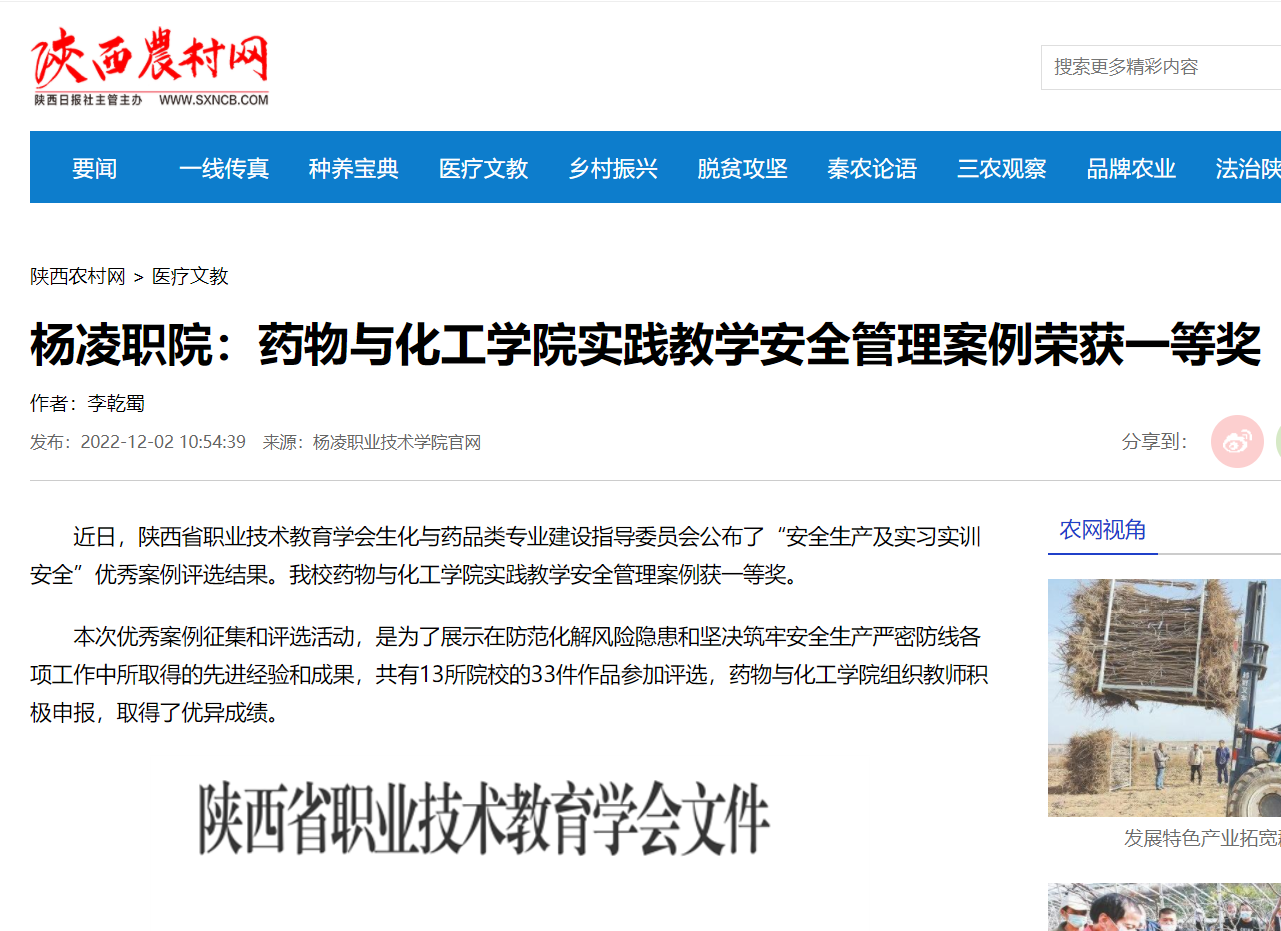 近日,陕西省职业技术教育学会生化与药品类专业建设指导委员会公布了“安全生产及实习实训安全”优秀案例评选结果。伟德官网药物与化工学院实践教学安全管理案例获一等奖。