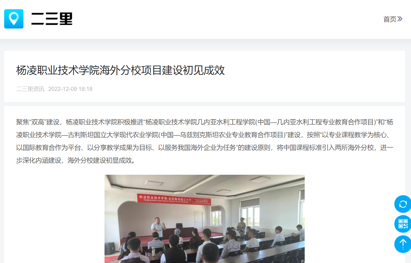聚焦“双高”建设,杨凌职业技术学院积极推进“杨凌职业技术学院几内亚水利工程学院(中国—几内亚水利工程专业教育合作项目)”和“杨凌职业技术学院—古利斯坦国立大学现代农业学院(中国—乌兹别克斯坦农业专业教育合作项目)”建设,按照“以专业课程教学为核心、以国际教育合作为平台、以分享教学成果为目标、以服务我国海外企业为任务”的建设原则,将中国课程标准引入两所海外分校,进一步深化内涵建设,海外分校建设初显成效。