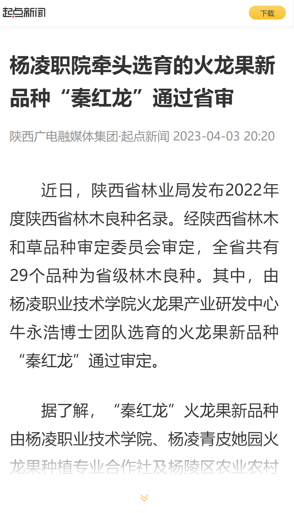 近日,陕西省林业局发布2022年度陕西省林木良种名录。经陕西省林木和草品种审定委员会审定,全省共有29个品种为省级林木良种。其中,由杨凌职业技术学院火龙果产业研发中心牛永浩博士团队选育的火龙果新品种“秦红龙”通过审定。