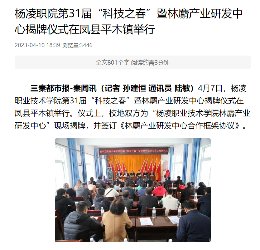 三秦都市报-秦闻讯(记者 孙建恒 通讯员 陆敏)4月7日,杨凌职业技术学院第31届“科技之春”暨林麝产业研发中心揭牌仪式在凤县平木镇举行。仪式上,校地双方为“杨凌职业技术学院林麝产业研发中心”现场揭牌,并签订《林麝产业研发中心合作框架协议》。