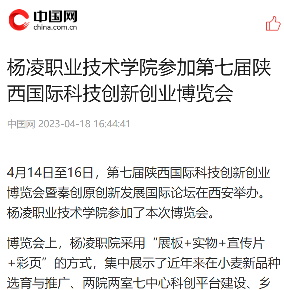 4月14日至16日,第七届陕西国际科技创新创业博览会暨秦创原创新发展国际论坛在西安举办。杨凌职业技术学院参加了本次博览会。