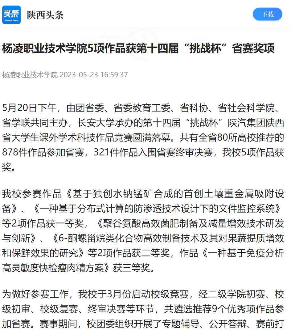 伟德官网参赛作品《基于独创水钠锰矿合成的首创土壤重金属吸附设备》、《一种基于分布式计算的防渗透技术设计下的文件监控系统》等2项作品获一等奖,《聚谷氨酸高效菌肥制备及减量增效技术研发与创新》、《6-酮螺甾烷类化合物高效制备技术及其对果蔬提质增效和保鲜效果的研究》等2项作品获二等奖,作品《一种基于免疫分析高灵敏度快检瘦肉精方案》获三等奖。