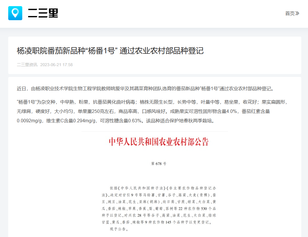【二三里】杨凌职院番茄新品种“杨番1号” 通过农业农村部品种登记