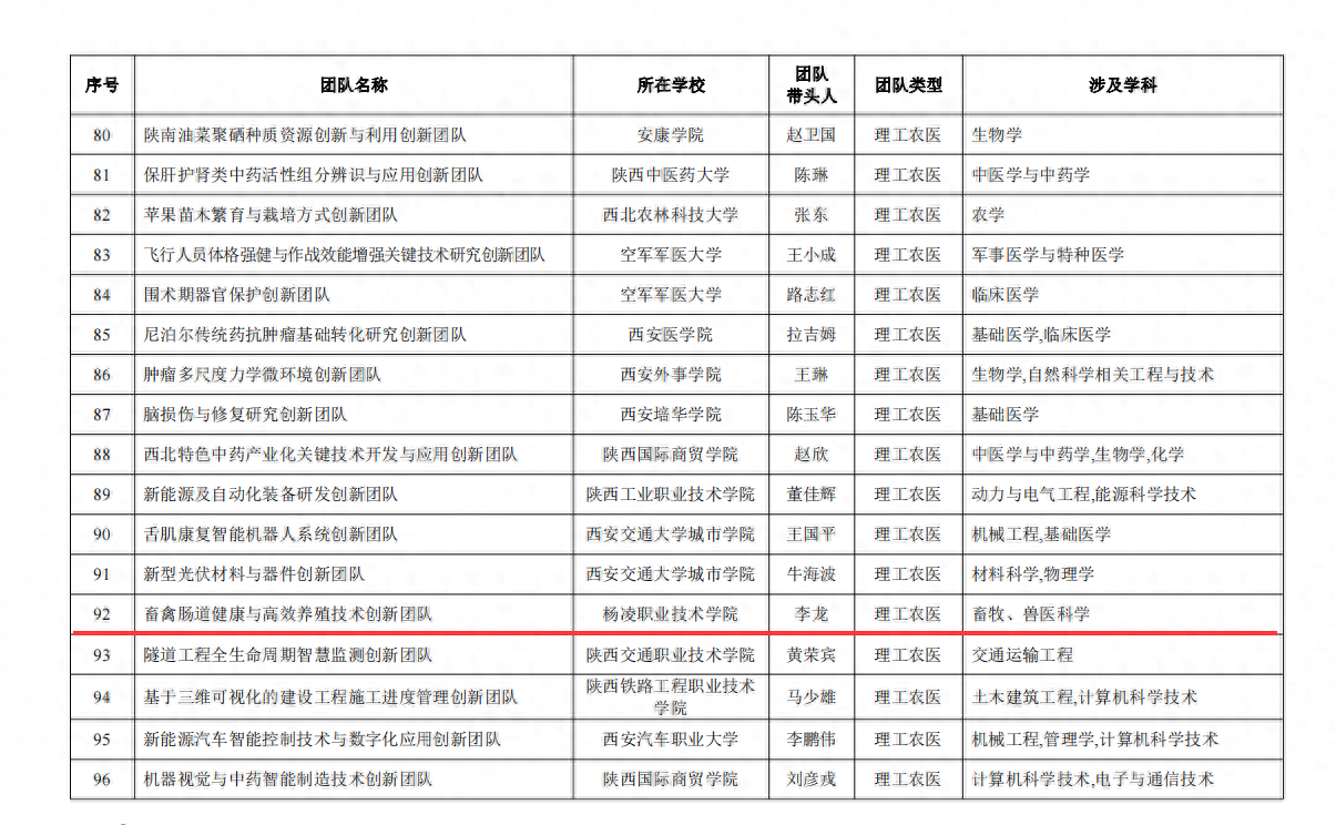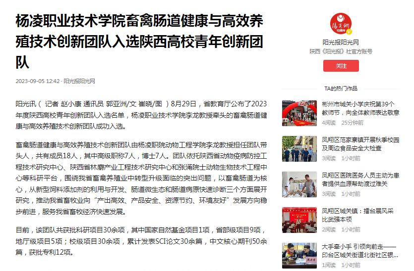 【阳光网·今日头条号】杨凌职业技术学院畜禽肠道健康与高效养殖技术创新团队入选陕西高校青年创新团队