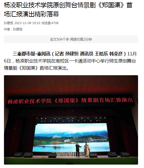 三秦都市报-秦闻讯(记者 孙建恒 通讯员 王皓乐 韩荣彦)11月6日,杨凌职业技术学院在南校区一卡通活动中心举行师生原创舞台情景剧《郑国渠》首场汇报演出。