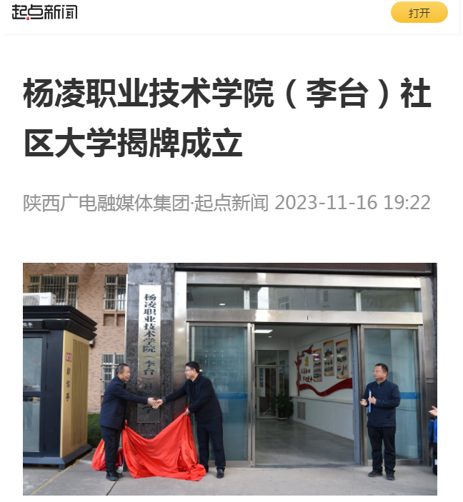 11月16日上午,杨凌职业技术学院(李台)社区大学正式揭牌成立。杨凌职业技术学院副校长胡俊鹏,杨陵区委副书记李永东出席揭牌仪式。