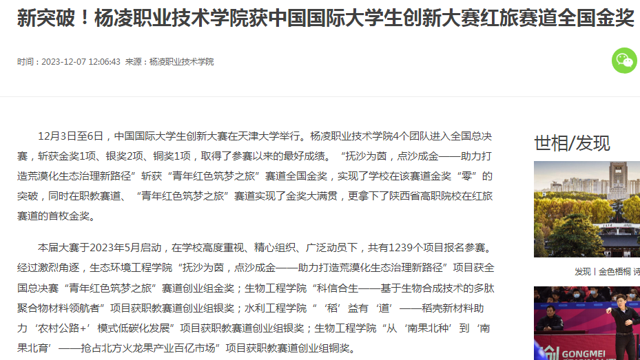 12月3日至6日,中国国际大学生创新大赛在天津大学举行。杨凌职业技术学院4个团队进入全国总决赛,斩获金奖1项、银奖2项、铜奖1项,取得了参赛以来的最好成绩。“抚沙为茵,点沙成金——助力打造荒漠化生态治理新路径”斩获“青年红色筑梦之旅”赛道全国金奖,实现了学校在该赛道金奖“零”的突破,同时在职教赛道、“青年红色筑梦之旅”赛道实现了金奖大满贯,更拿下了陕西省高职院校在红旅赛道的首枚金奖。