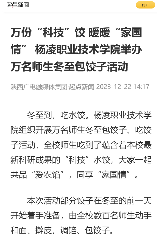 “今天是我们传统节日冬至,在学校吃上了热腾腾的科技水饺,我们心里非常温暖,也感受到这份水饺包含的科技报国的内涵。”杨凌职业技术学院建筑工程学院大一学生何蓉蓉表示,要刻苦学习、练好本领,参加工作以后积极投入到乡村振兴当中,为农业强国建设作出自己的贡献。