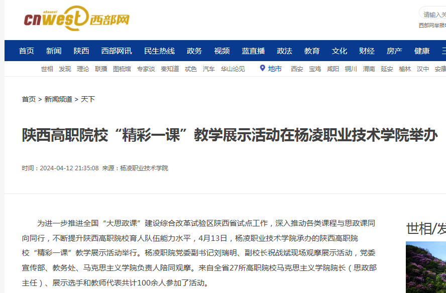 为进一步推进全国“大思政课”建设综合改革试验区陕西省试点工作,深入推动各类课程与思政课同向同行,不断提升陕西高职院校育人队伍能力水平,4月13日,杨凌职业技术学院承办的陕西高职院校“精彩一课”教学展示活动举行。杨凌职院党委副书记刘瑞明、副校长祝战斌现场观摩展示活动,党委宣传部、教务处、马克思主义学院负责人陪同观摩。来自全省27所高职院校马克思主义学院院长(思政部主任)、展示选手和教师代表共计100余人参加了活动。