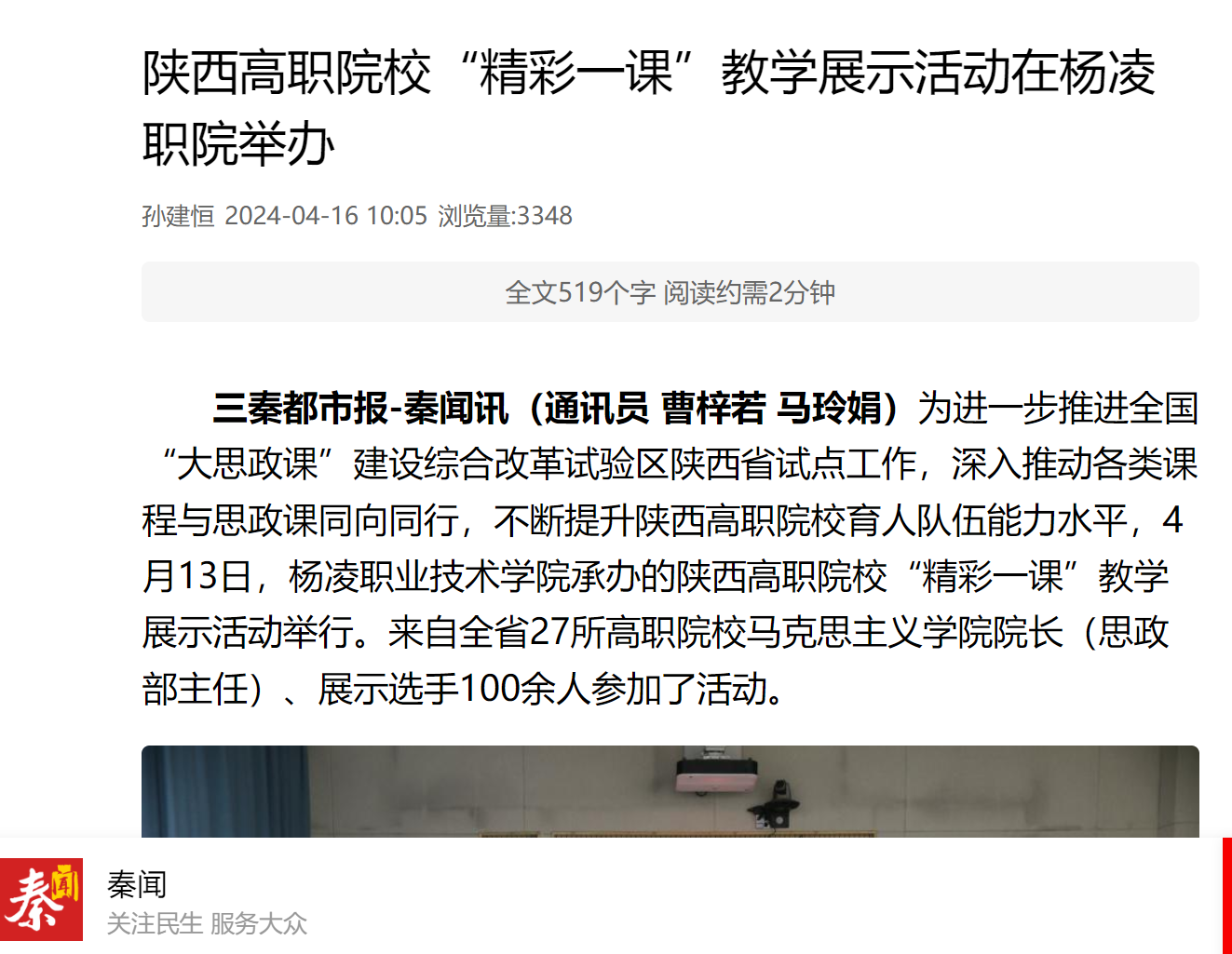 三秦都市报-秦闻讯(通讯员 曹梓若 马玲娟)为进一步推进全国“大思政课”建设综合改革试验区陕西省试点工作,深入推动各类课程与思政课同向同行,不断提升陕西高职院校育人队伍能力水平,4月13日,杨凌职业技术学院承办的陕西高职院校“精彩一课”教学展示活动举行。来自全省27所高职院校马克思主义学院院长(思政部主任)、展示选手100余人参加了活动。