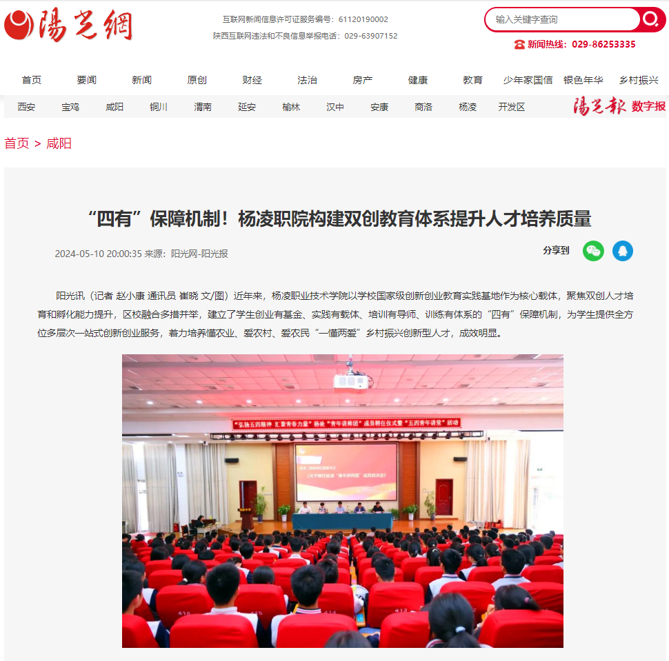 阳光讯(记者 赵小康 通讯员 崔晓 文/图)近年来,杨凌职业技术学院以学校国家级创新创业教育实践基地作为核心载体,聚焦双创人才培育和孵化能力提升,区校融合多措并举,建立了学生创业有基金、实践有载体、培训有导师、训练有体系的“四有”保障机制,为学生提供全方位多层次一站式创新创业服务,着力培养懂农业、爱农村、爱农民“一懂两爱”乡村振兴创新型人才,成效明显。