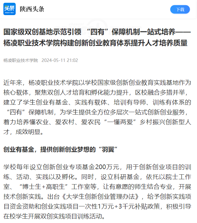 【陕西头条】国家级双创基地示范引领 “四有”保障机制一站式培养——杨凌职业技术学院构建创新创业教育体系提升人才培养质量