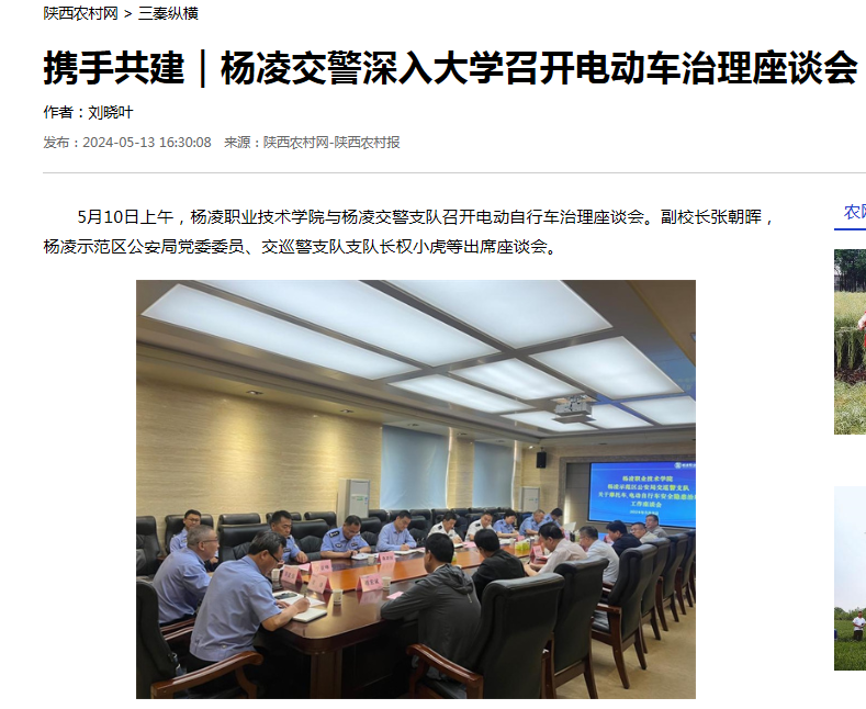 5月10日上午,杨凌职业技术学院与杨凌交警支队召开电动自行车治理座谈会。副校长张朝晖,杨凌示范区公安局党委委员、交巡警支队支队长权小虎等出席座谈会。