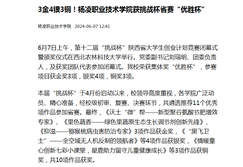 本届“挑战杯”于4月份启动以来,校领导高度重视,各学院广泛动员、精心准备,经校级初审、复赛、决赛环节,共遴选推荐11个优秀项作品参加省赛。最终,《沃土“微”帮——新型聚谷氨酸节肥增效专家》、《果色蔬香——绿色果蔬原生态生长调节剂创新先锋》、《抑滋——猕猴桃病虫害防治专家》3项作品获金奖,《“黑飞卫士”——全空域无人机反制的领航者》等4项作品获银奖,《情暖童心创新七彩小课堂,星鹿助力留守儿童健康成长》等3项作品获铜奖,共10项作品获奖。