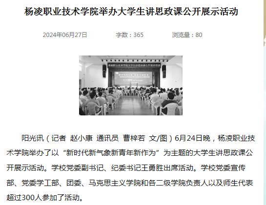 6月24日晚,杨凌职业技术学院举办了以“新时代新气象新青年新作为”为主题的大学生讲思政课公开展示活动。学校党委副书记、纪委书记王勇胜出席活动。学校党委宣传部、党委学工部、团委、马克思主义学院和各二级学院负责人以及师生代表超过300人参加了活动。