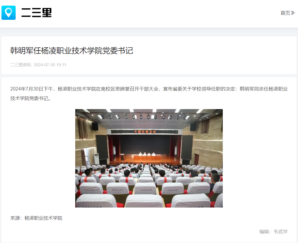 【起点新闻】韩明军任杨凌职业技术学院党委书记