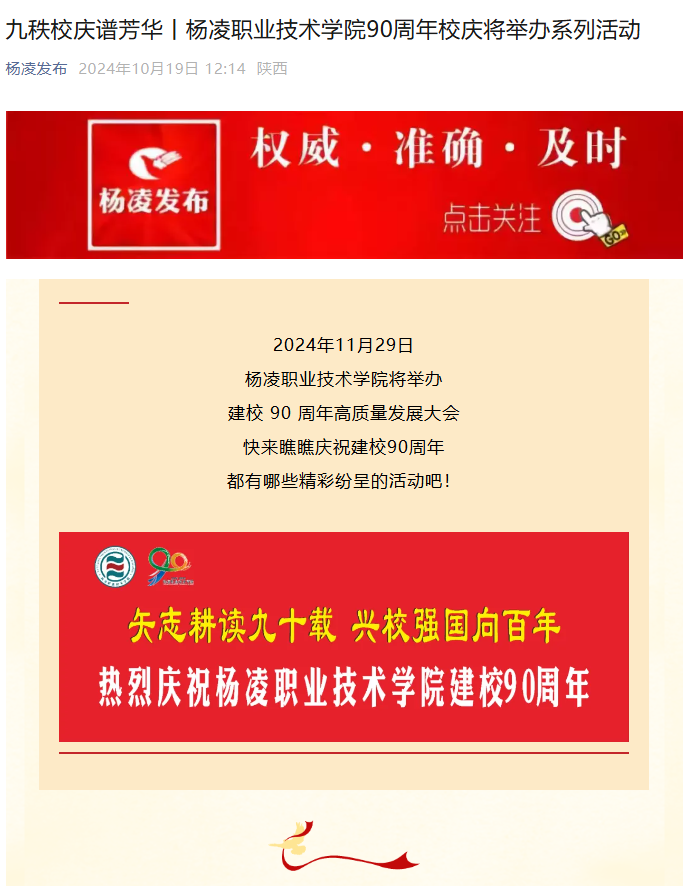【杨凌发布】九秩校庆谱芳华丨杨凌职业技术学院90周年校庆将举办系列活动