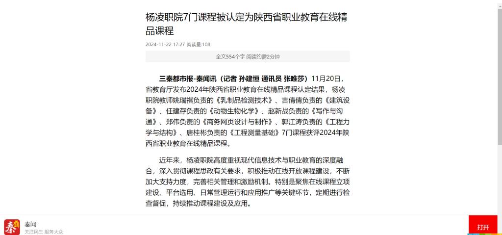 三秦都市报-秦闻讯(记者 孙建恒 通讯员 张唯莎)11月20日,省教育厅发布2024年陕西省职业教育在线精品课程认定结果,杨凌职院教师姚瑞祺负责的《乳制品检测技术》、吉倩倩负责的《建筑设备》、任建存负责的《动物生物化学》、赵新战负责的《写作与沟通》、郑伟负责的《商务网页设计与制作》、郭江涛负责的《工程力学与结构》、唐桂彬负责的《工程测量基础》7门课程获评2024年陕西省职业教育在线精品课程。