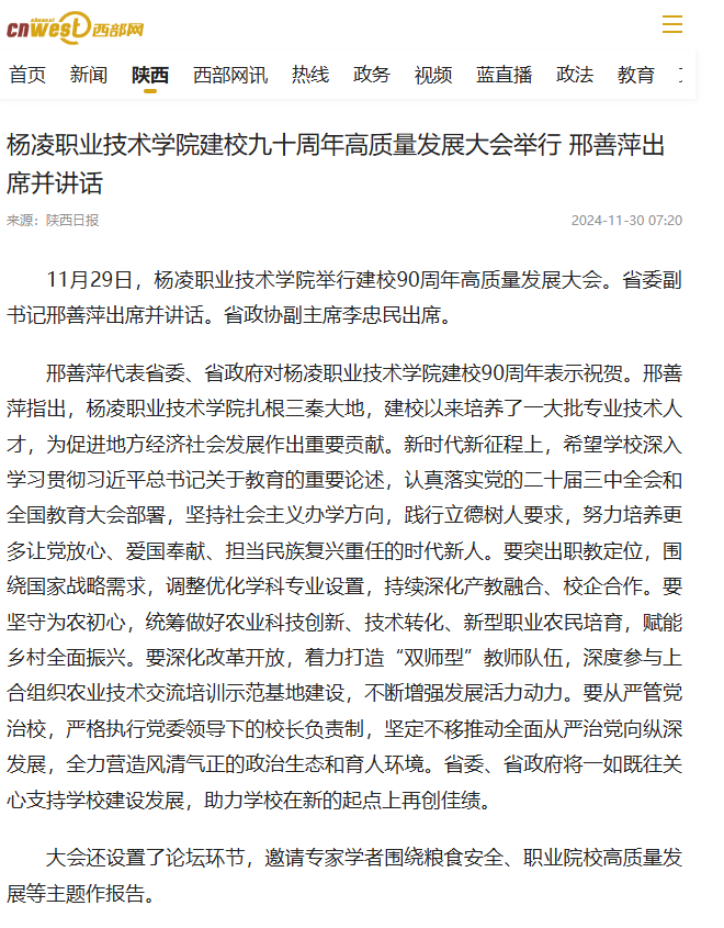 【西部网】杨凌职业技术学院建校九十周年高质量发展大会举行 邢善萍出席并讲话