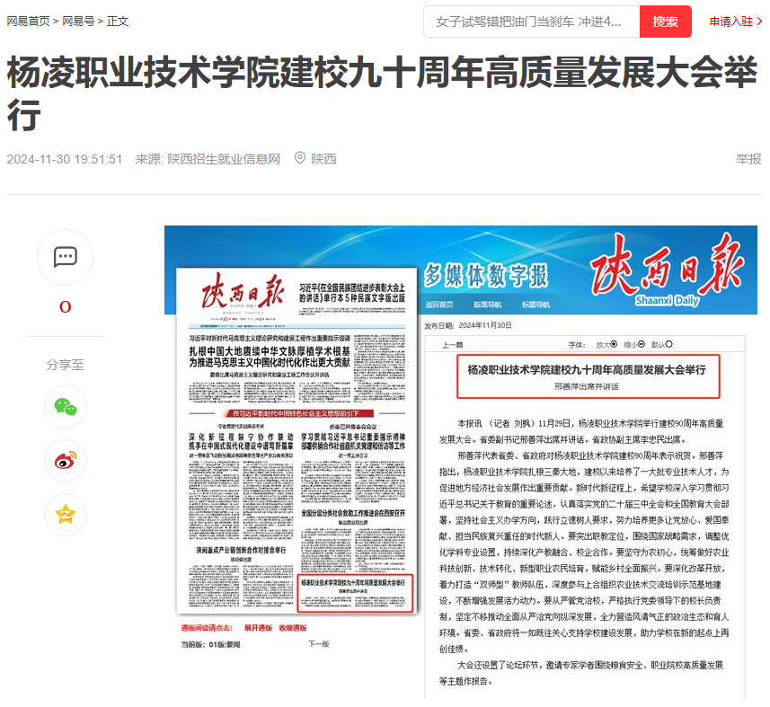 【网易号】杨凌职业技术学院建校九十周年高质量发展大会举行