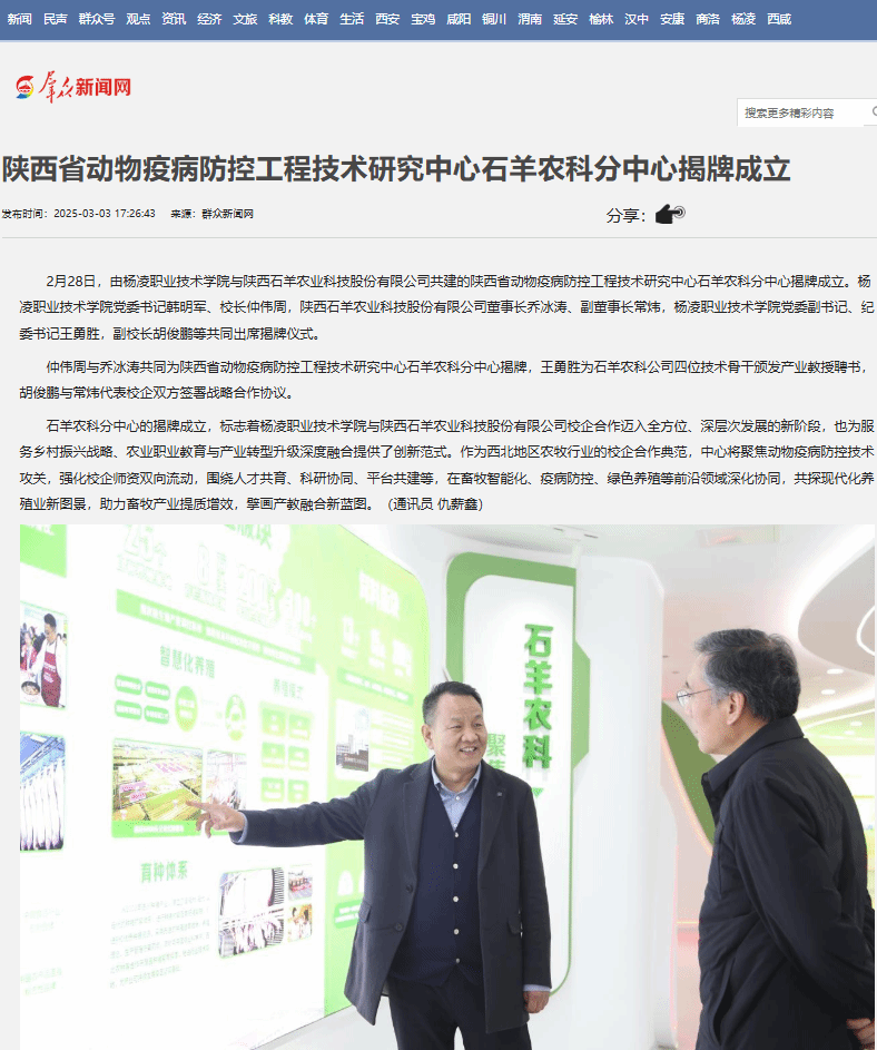 【群众新闻网】陕西省动物疫病防控工程技术研究中心石羊农科分中心揭牌成立