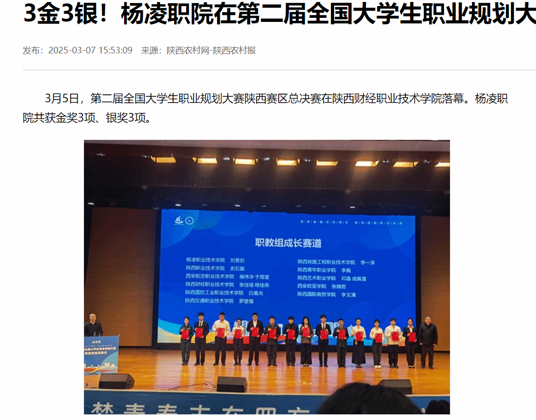 3月5日,第二届全国大学生职业规划大赛陕西赛区总决赛在陕西财经职业技术学院落幕。杨凌职院共获金奖3项、银奖3项。