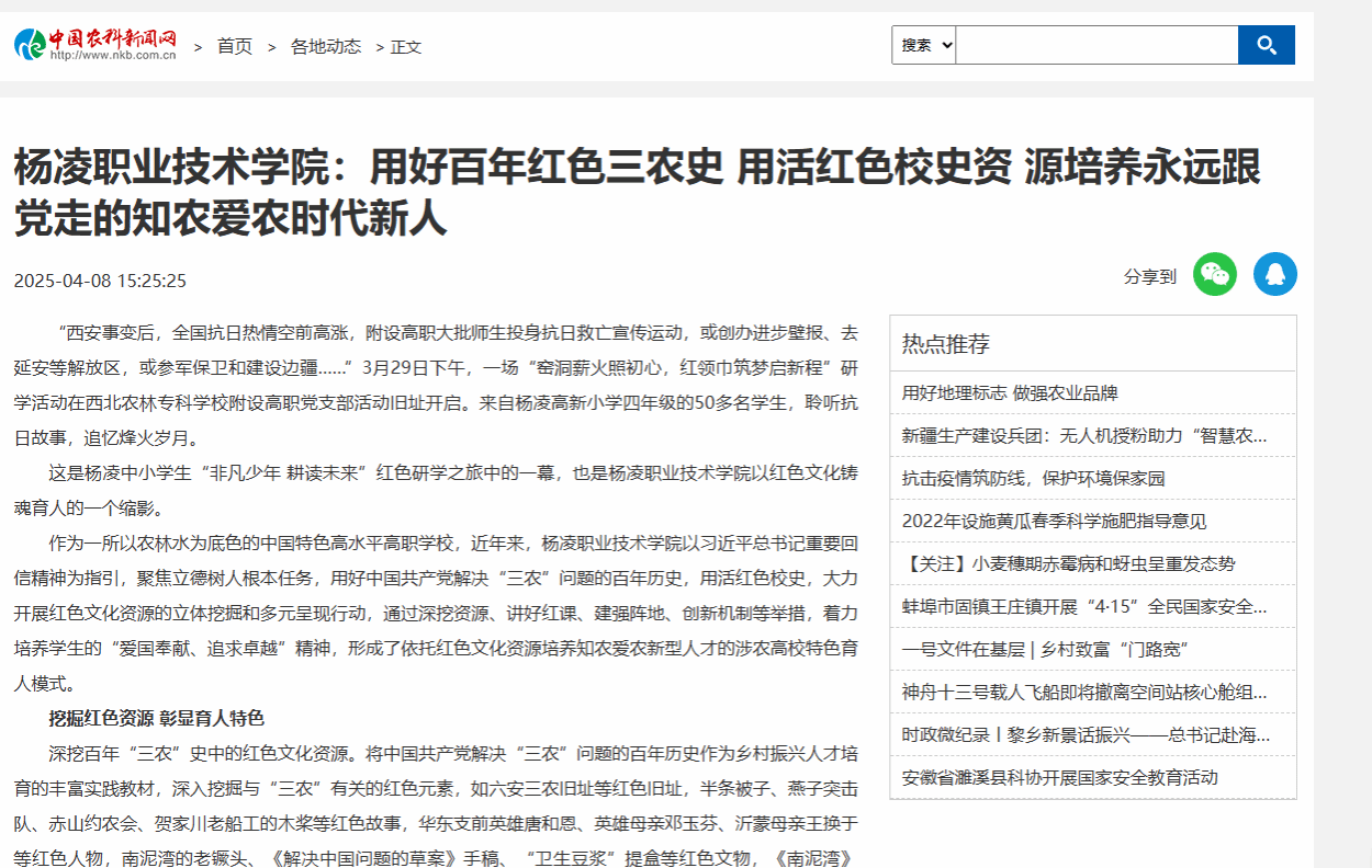 【中国农科新闻网】杨凌职业技术学院:用好百年红色三农史 用活红色校史资源 培养永远跟党走的知农爱农时代新人