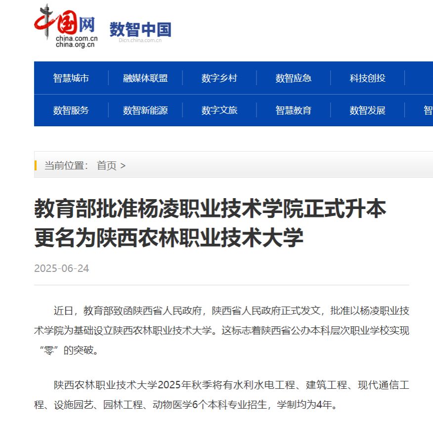 【中国网】教育部批准杨凌职业技术学院正式升本 更名为bv伟德国际1946