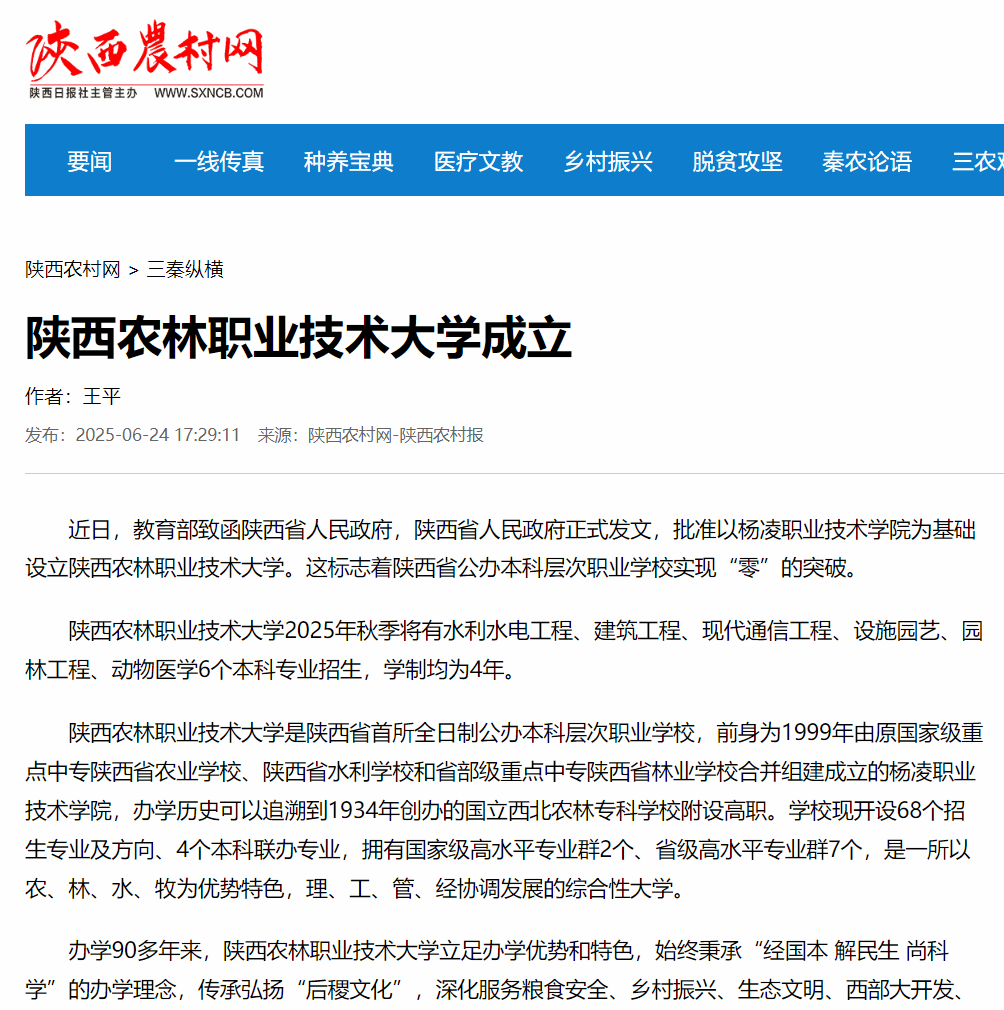 近日,教育部致函陕西省人民政府,陕西省人民政府正式发文,批准以杨凌职业技术学院为基础设立bv伟德国际1946。这标志着陕西省公办本科层次职业学校实现“零”的突破。