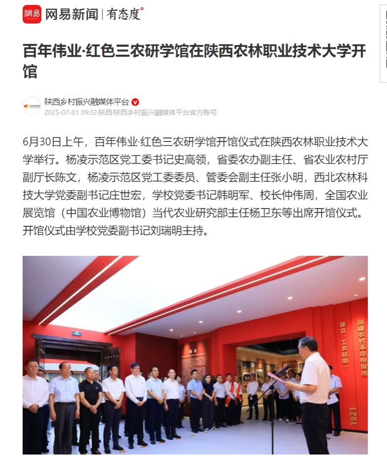 6月30日上午,百年伟业·红色三农研学馆开馆仪式在bv伟德国际1946举行。杨凌示范区党工委书记史高领,省委农办副主任、省农业农村厅副厅长陈文,杨凌示范区党工委委员、管委会副主任张小明,西北农林科技大学党委副书记庄世宏,学校党委书记韩明军、校长仲伟周,全国农业展览馆(中国农业博物馆)当代农业研究部主任杨卫东等出席开馆仪式。开馆仪式由学校党委副书记刘瑞明主持。
