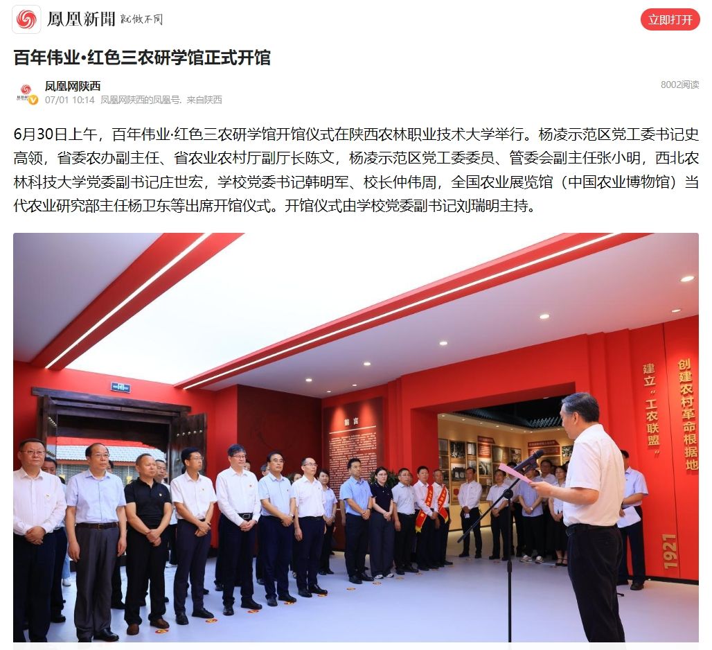 6月30日上午,百年伟业·红色三农研学馆开馆仪式在bv伟德国际1946举行。杨凌示范区党工委书记史高领,省委农办副主任、省农业农村厅副厅长陈文,杨凌示范区党工委委员、管委会副主任张小明,西北农林科技大学党委副书记庄世宏,学校党委书记韩明军、校长仲伟周,全国农业展览馆(中国农业博物馆)当代农业研究部主任杨卫东等出席开馆仪式。开馆仪式由学校党委副书记刘瑞明主持。